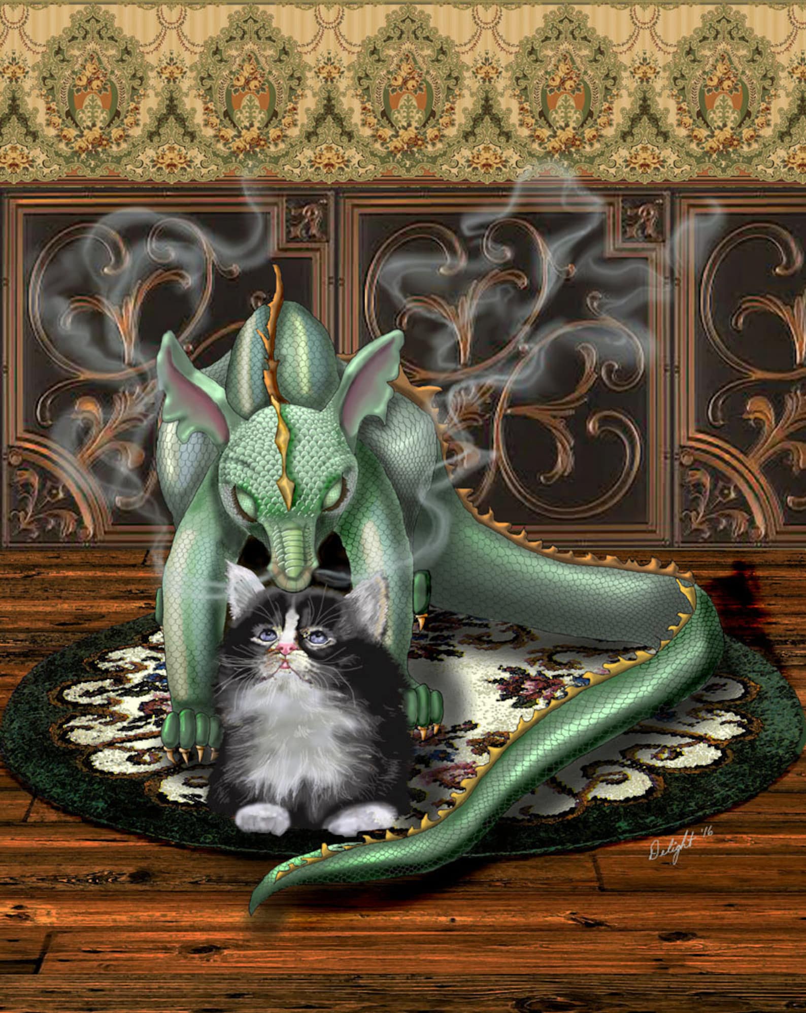 These two babies are already the Best of Friends and you can see the adoration in the kittens face for her big new friend as he bends protectively over the kitten. This is the fun side of cat and dragon art.