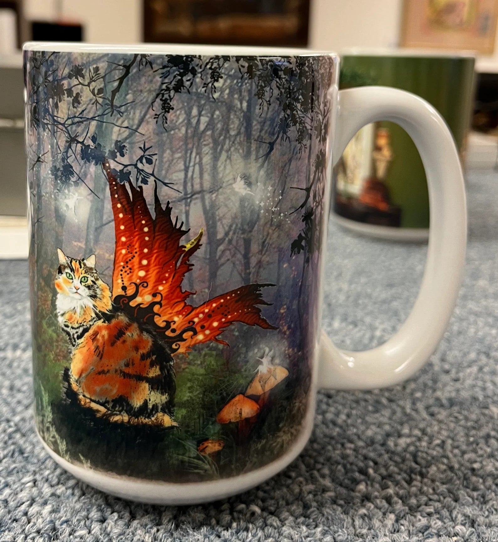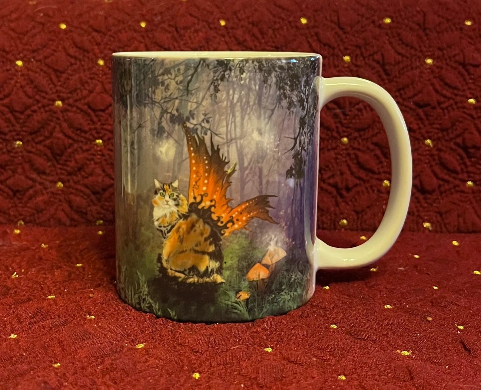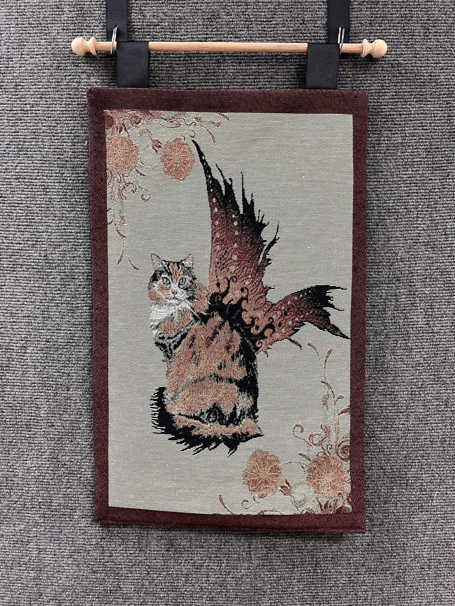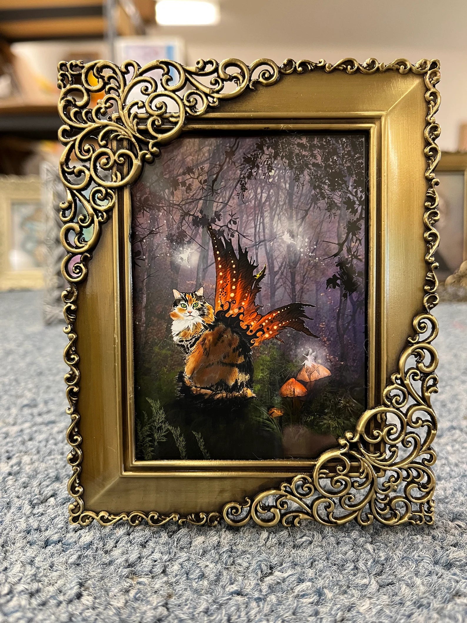 Calico cat. He's beautiful, sweet and mysterious. A little calico cat with wings sits quietly looking right at you.