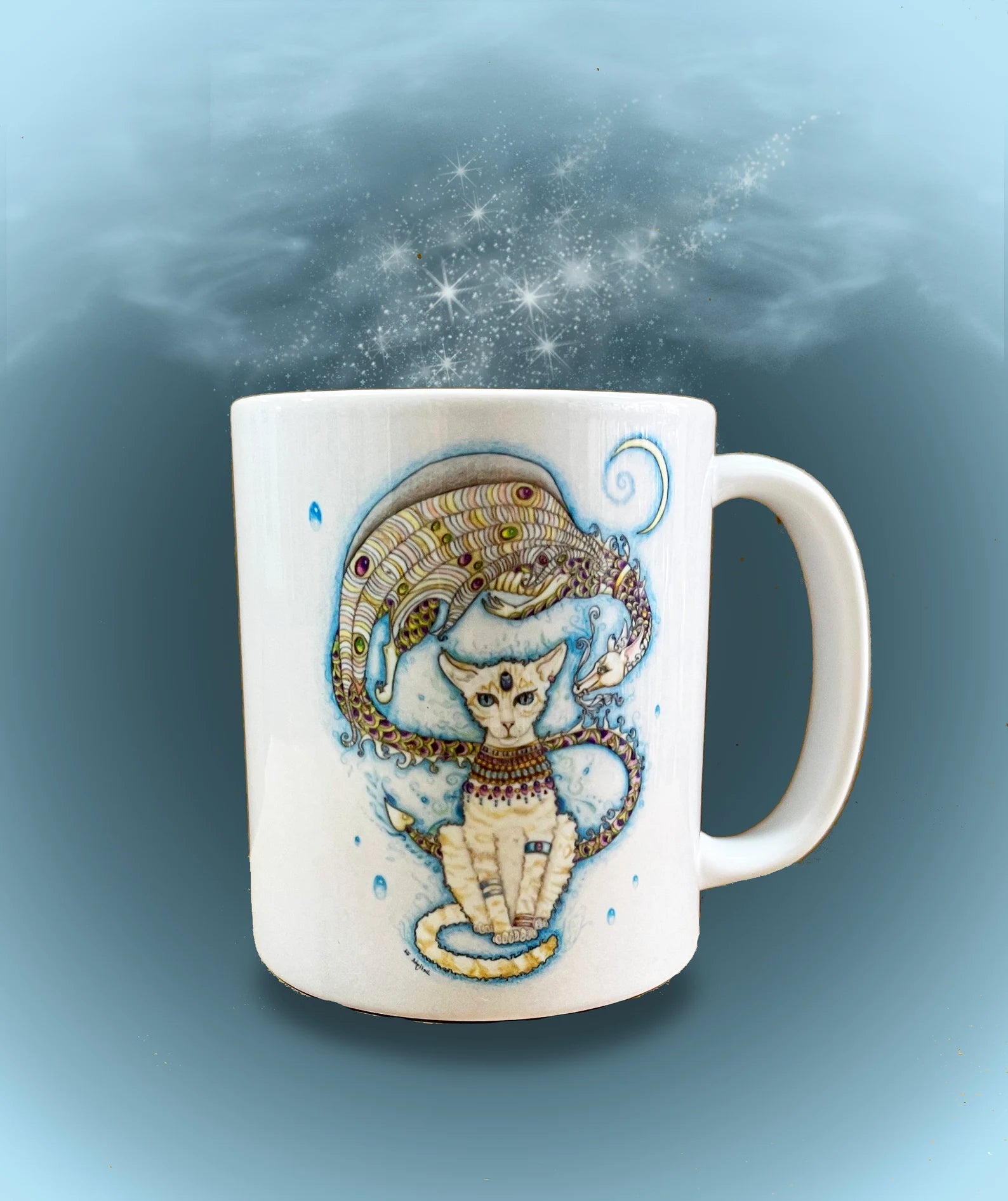 This is an elegant depiction of Bast with a regal dragon curled behind her.
