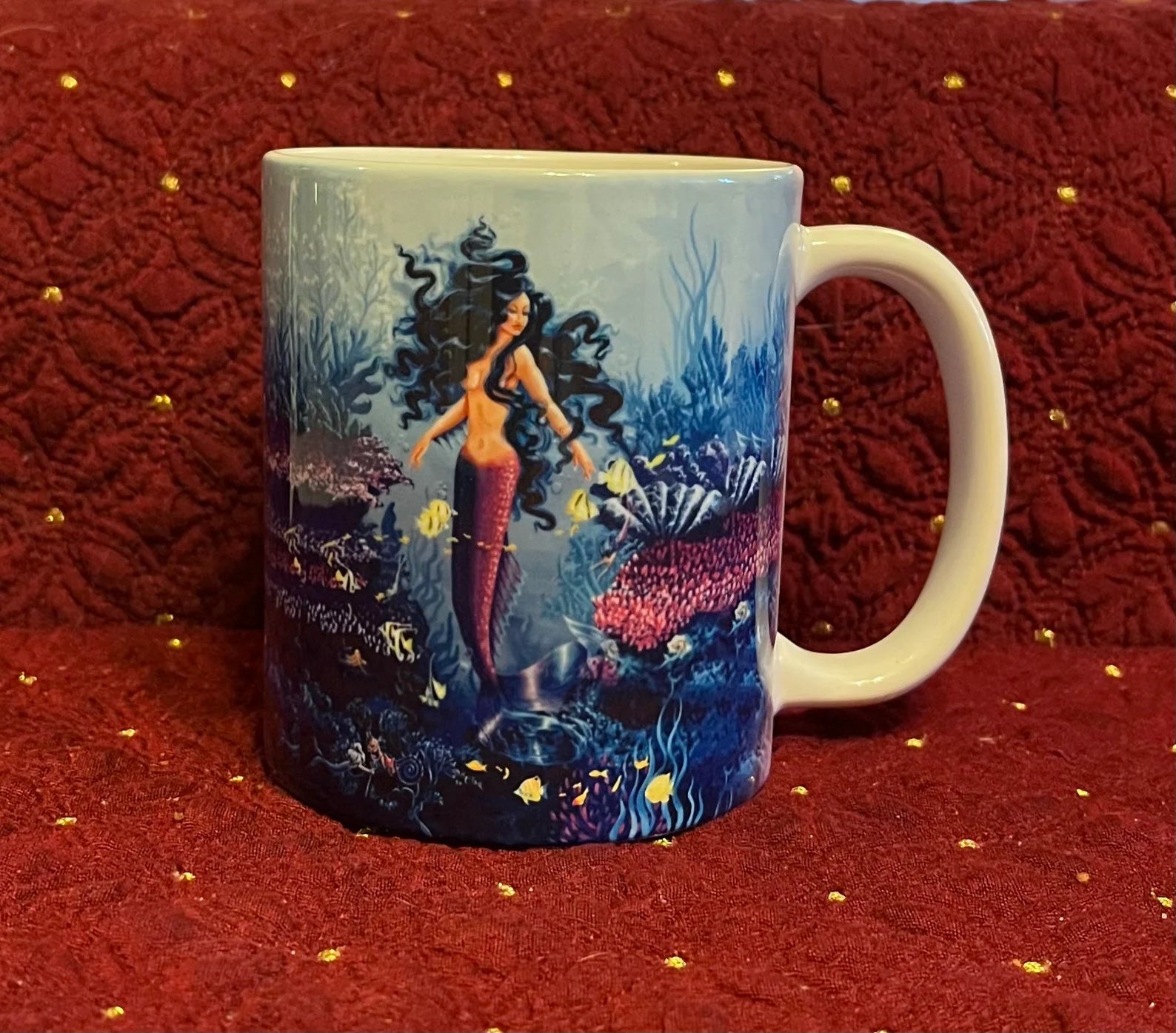 This peaceful mermaid is surrounded by many smaller mermaids. Look closely and you will see them floating around her