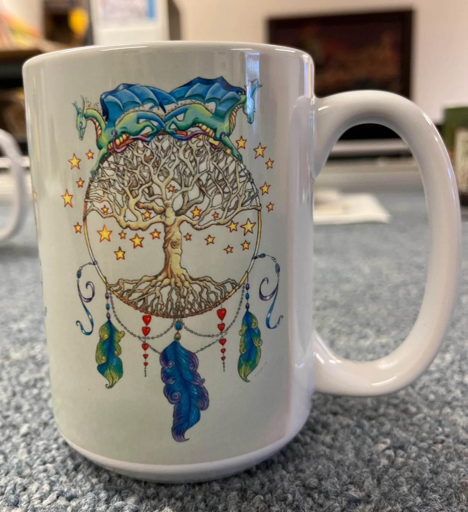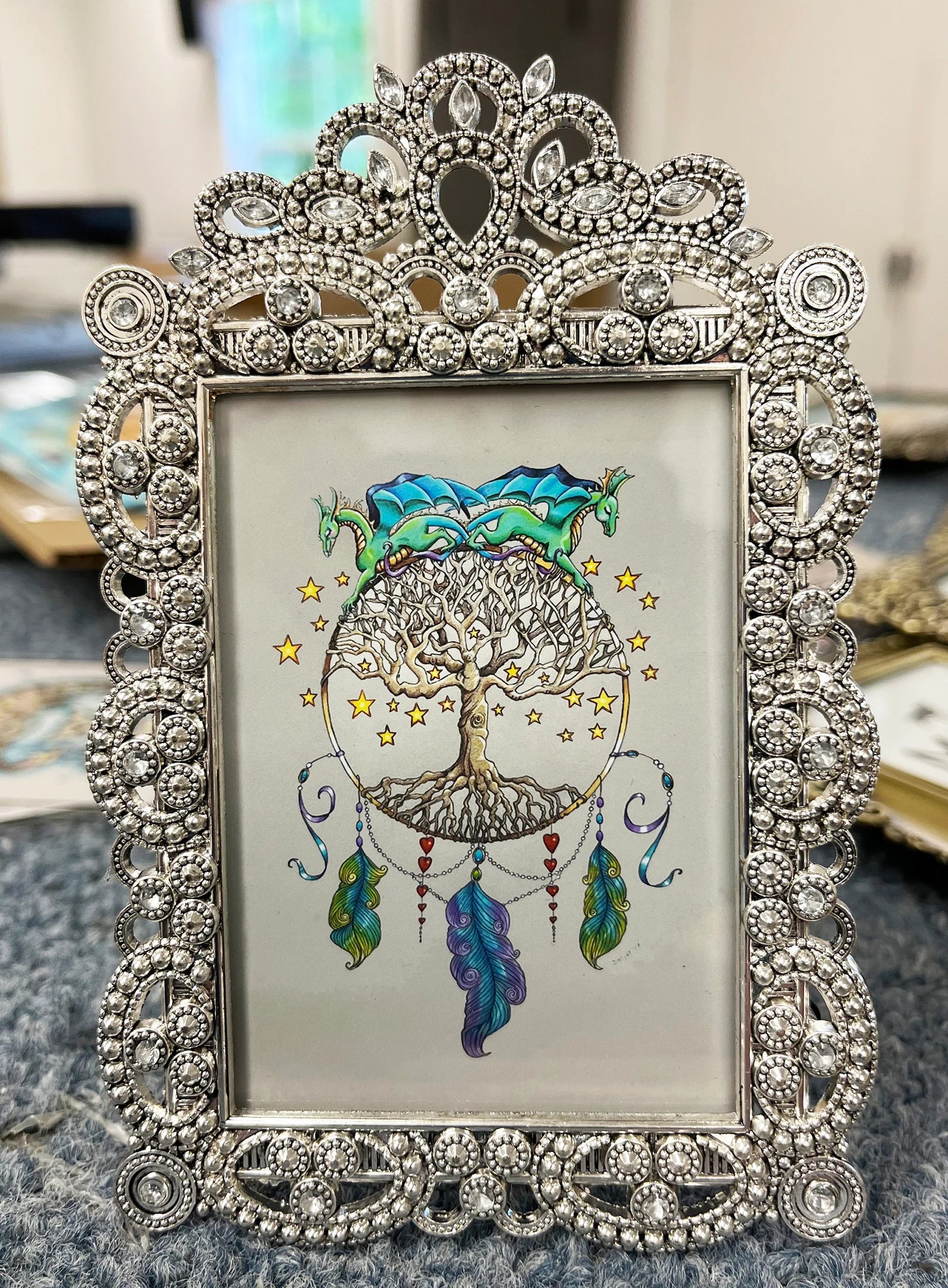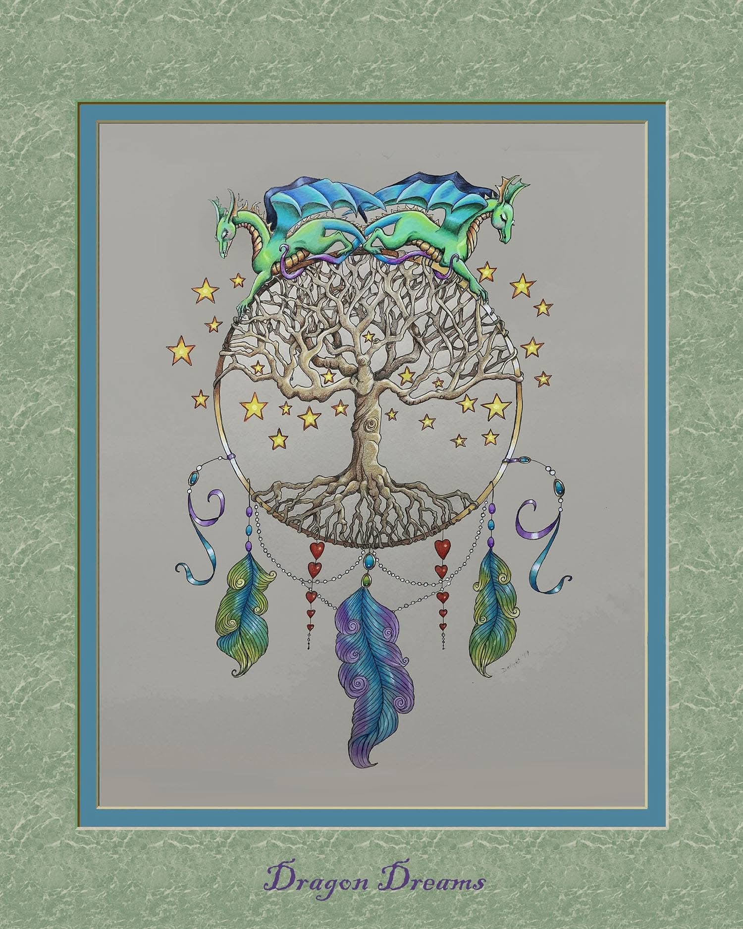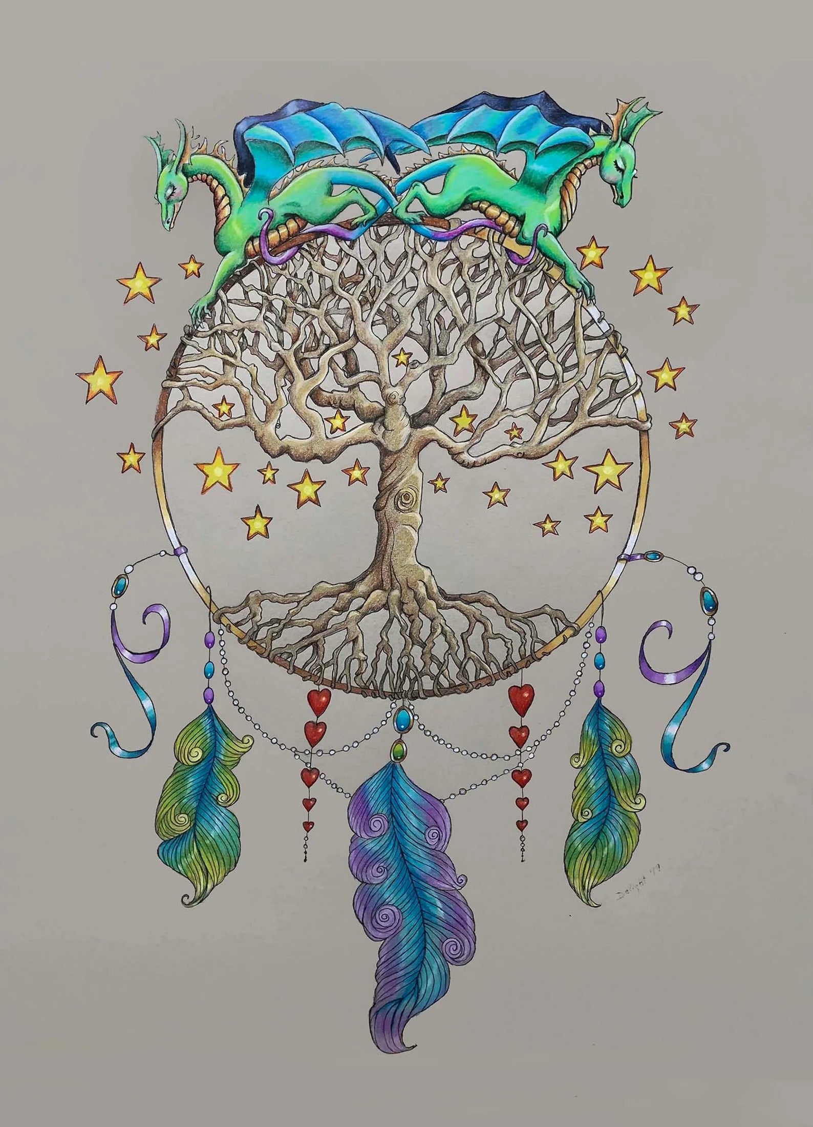 This is a dream catcher that has a very personal feel to Delight. Dragons have always played a large part in Delight's life, the stars represent what may happen, the tree is all of the convoluted pathways life can take, the feathers are hopes, the hearts stand for love, and the jewels and ribbons the beauty we find as we journey through this world.