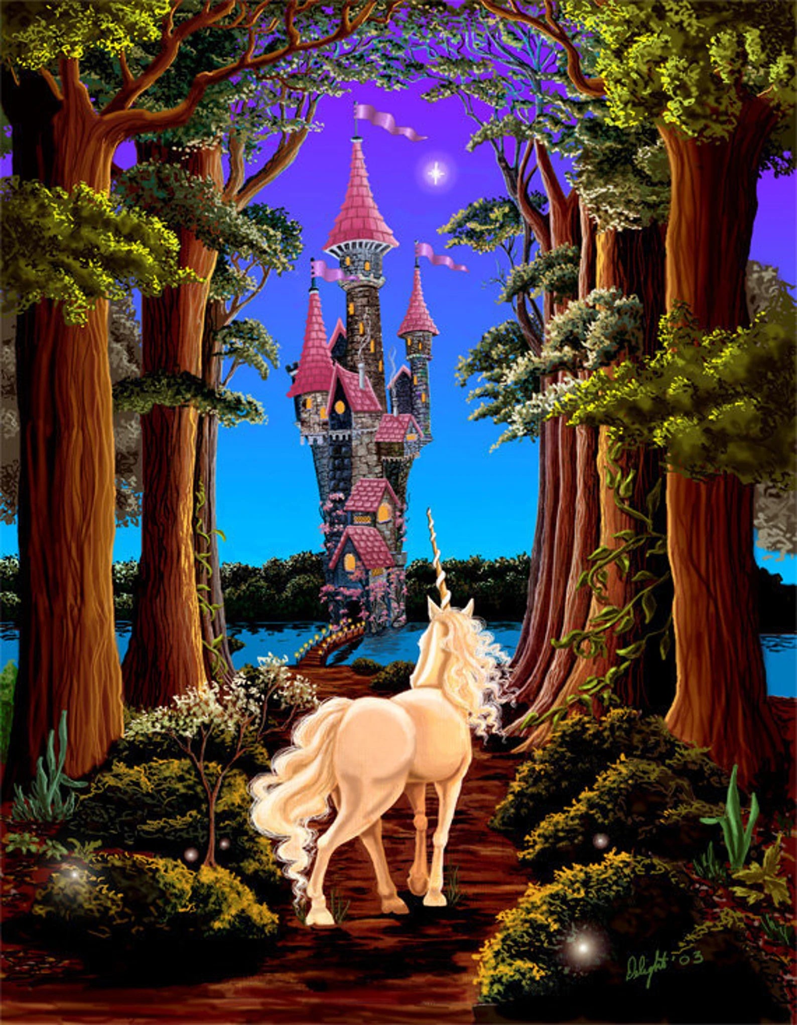 This piece done in deep jewel tones is a magical very quintessential fairy tale piece of the unicorn gazing at the castle as the first star of the evening twinkles in the evening sky.