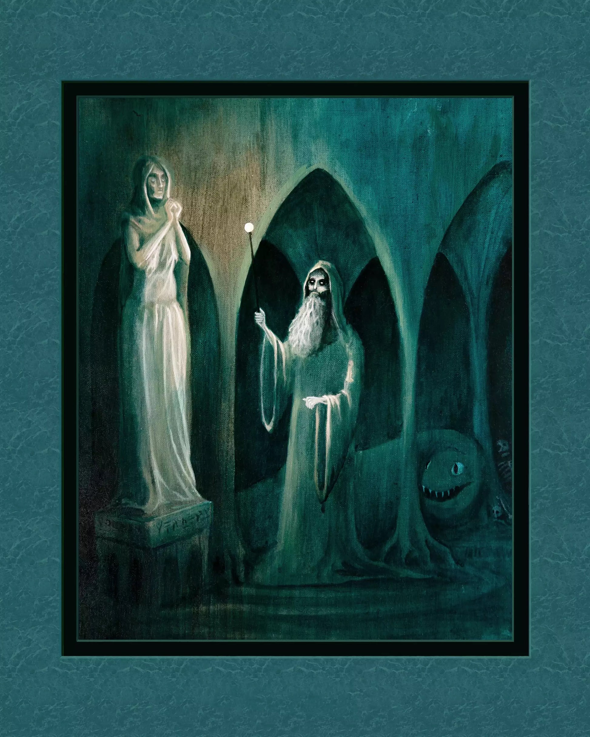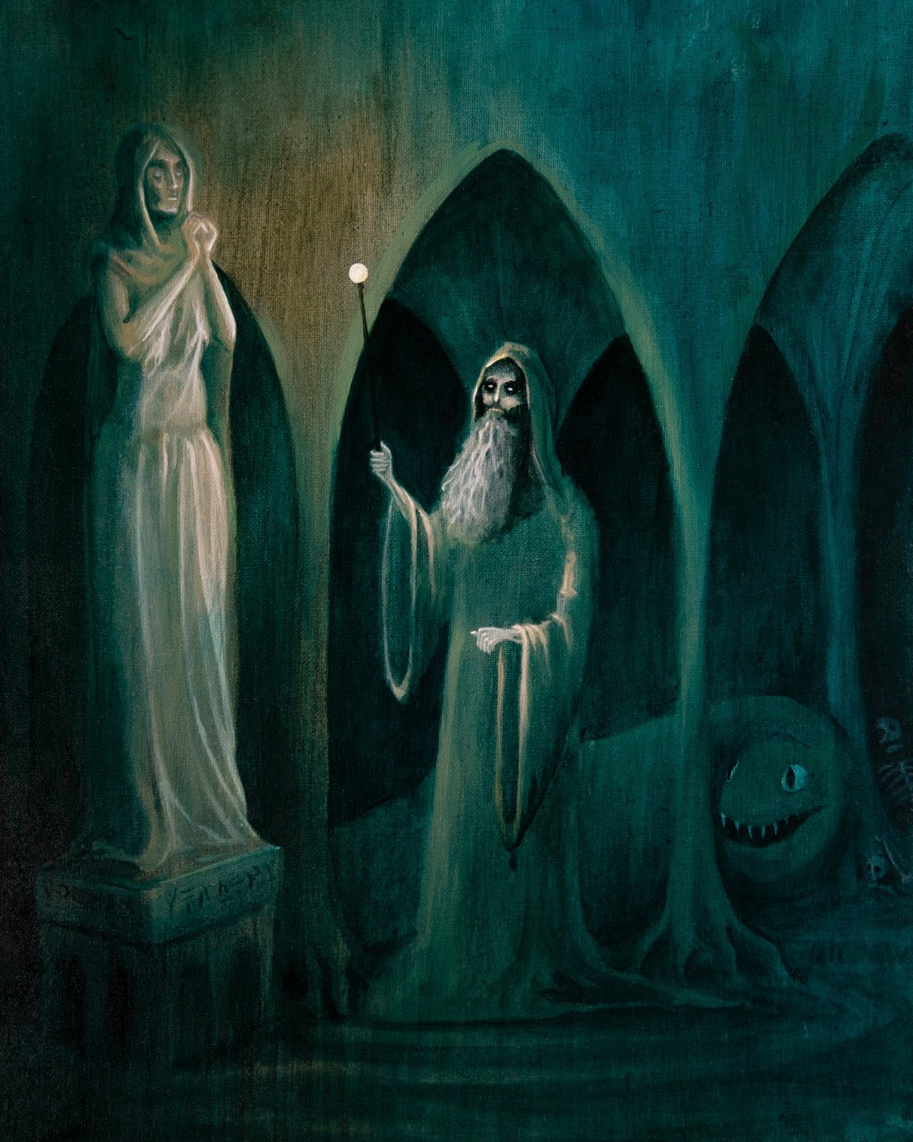 A skeletal sorcerer's wand illuminations a prayerful statue. What's that in the background? Friend or foe? Perhaps we need a little more illumination.