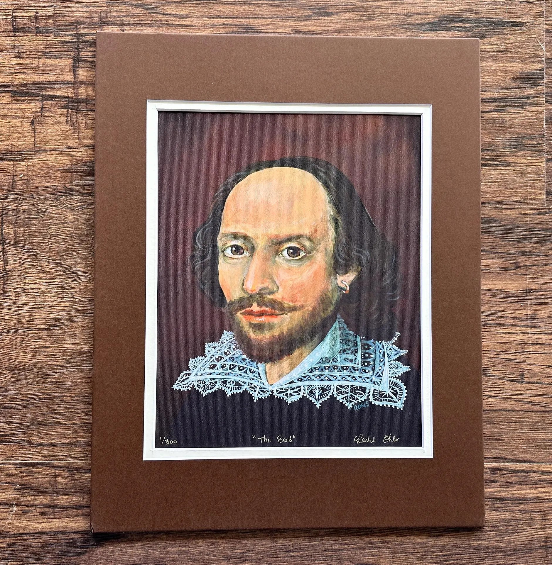 It's the Bard, himself! Inspired by a number of historical portraits, this version of Williams Shakespeare was loving painted with exquisite detail in the collar and delicate highlights in his eyes and earring.