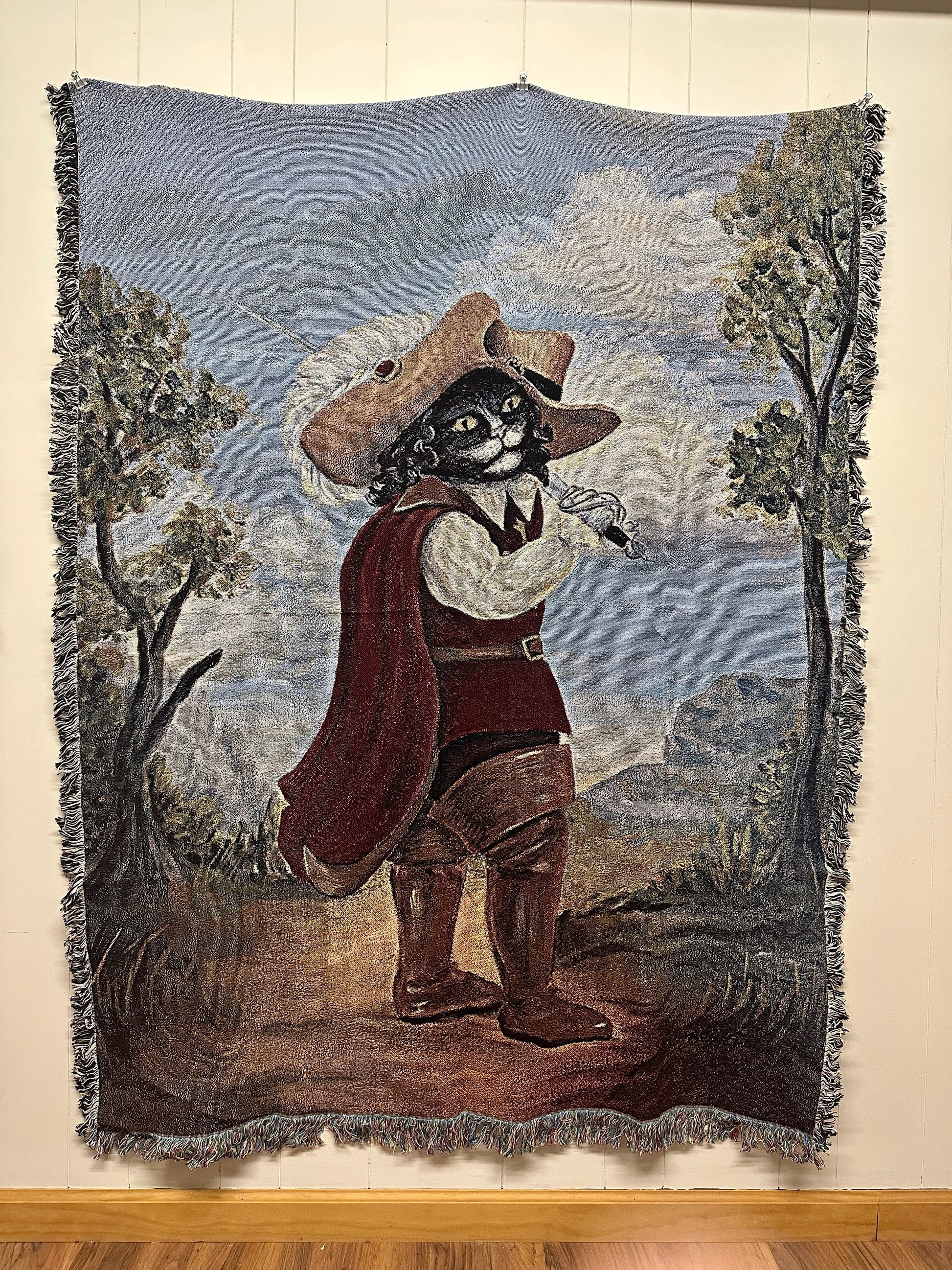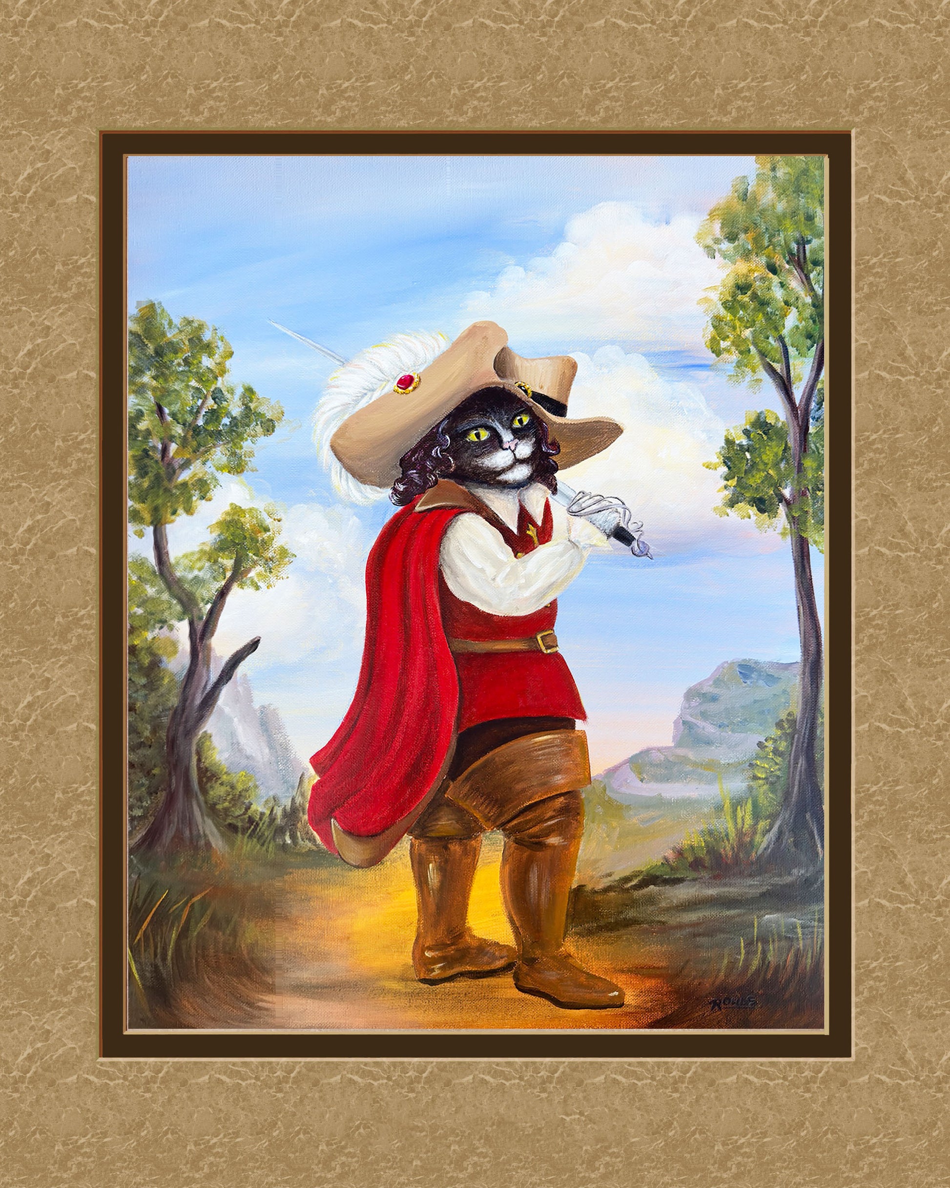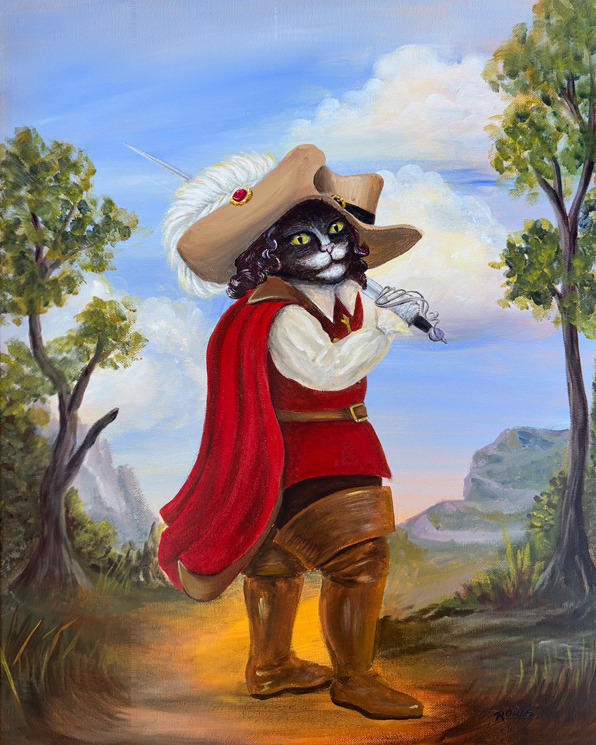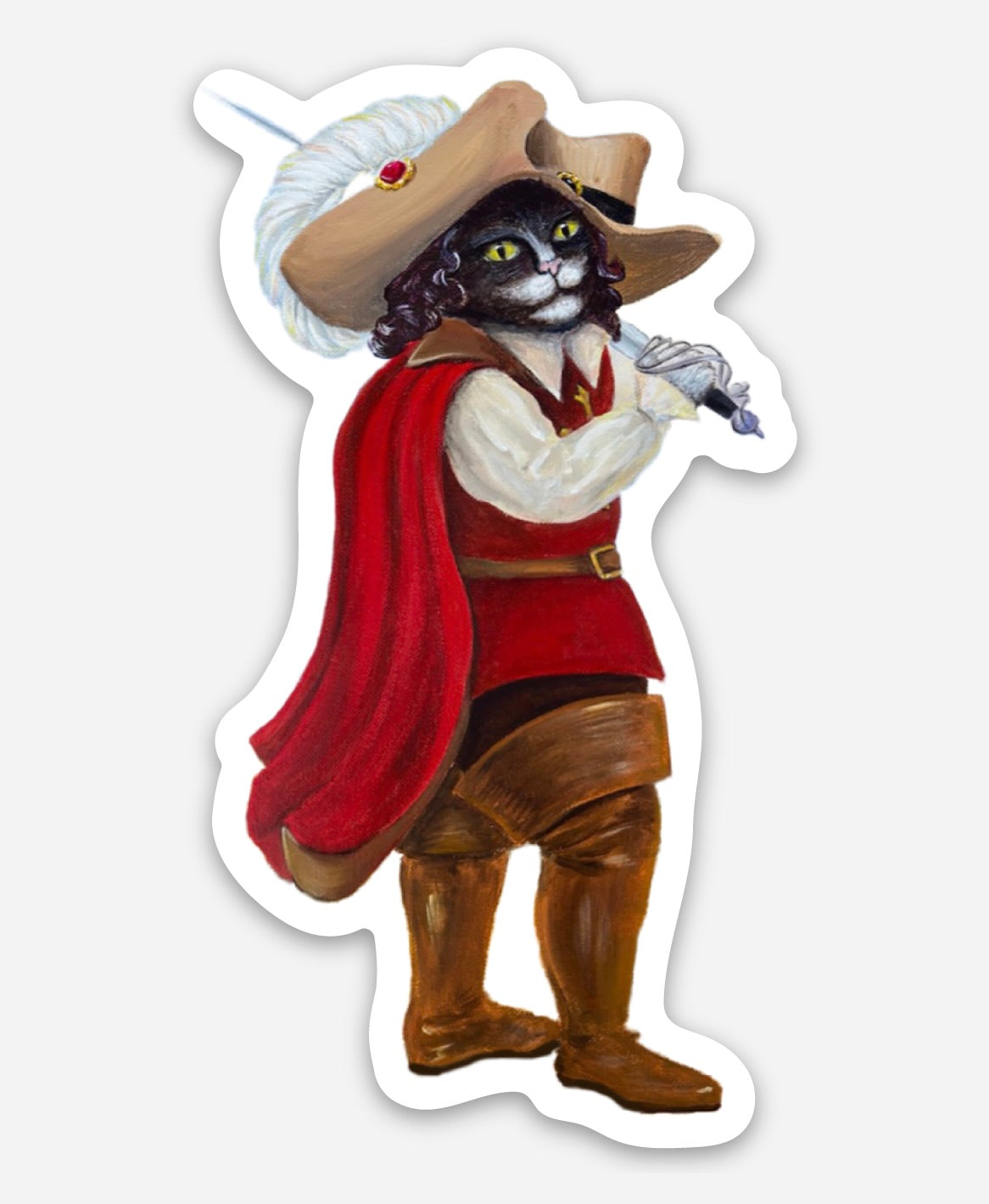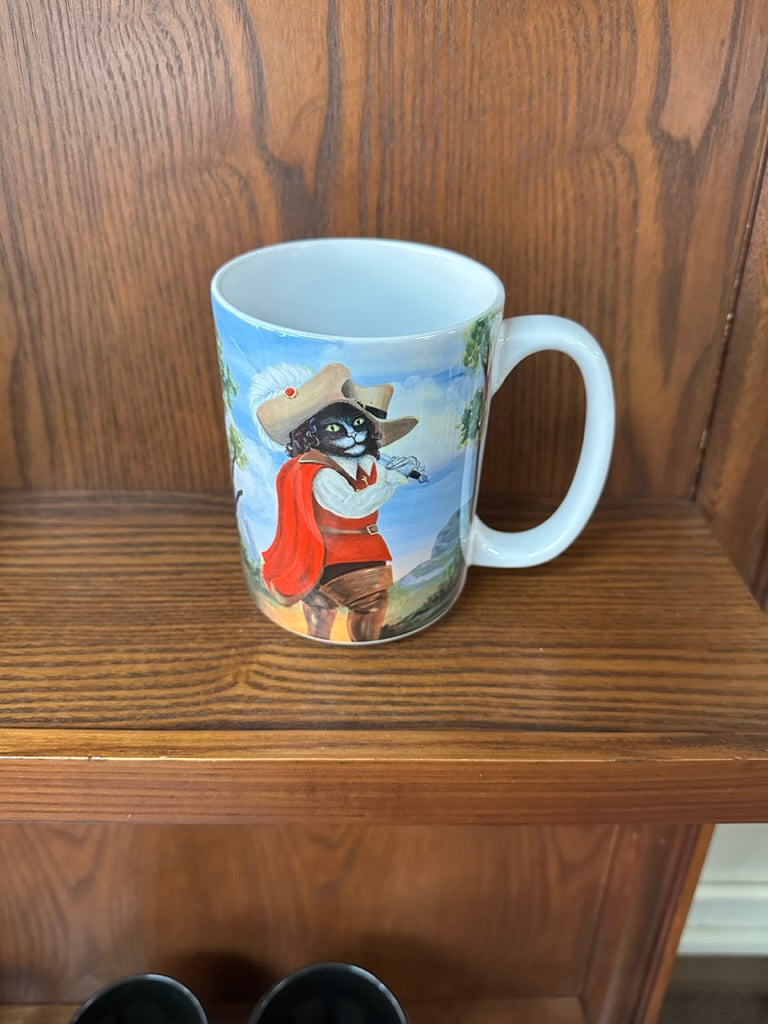 Not quite straight from the pages, but inspired by the classic Grimm's Fairy Tales version of Puss in Boots, this dashing Tuxedo cat has obtained his boots (and the rest of his 'fit!) from a French Musketeer. There are many honorable adventures to be had protecting the king and making your fortune!